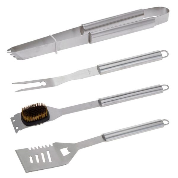 - Deze roestvrijstalen barbecueset bestaat uit: