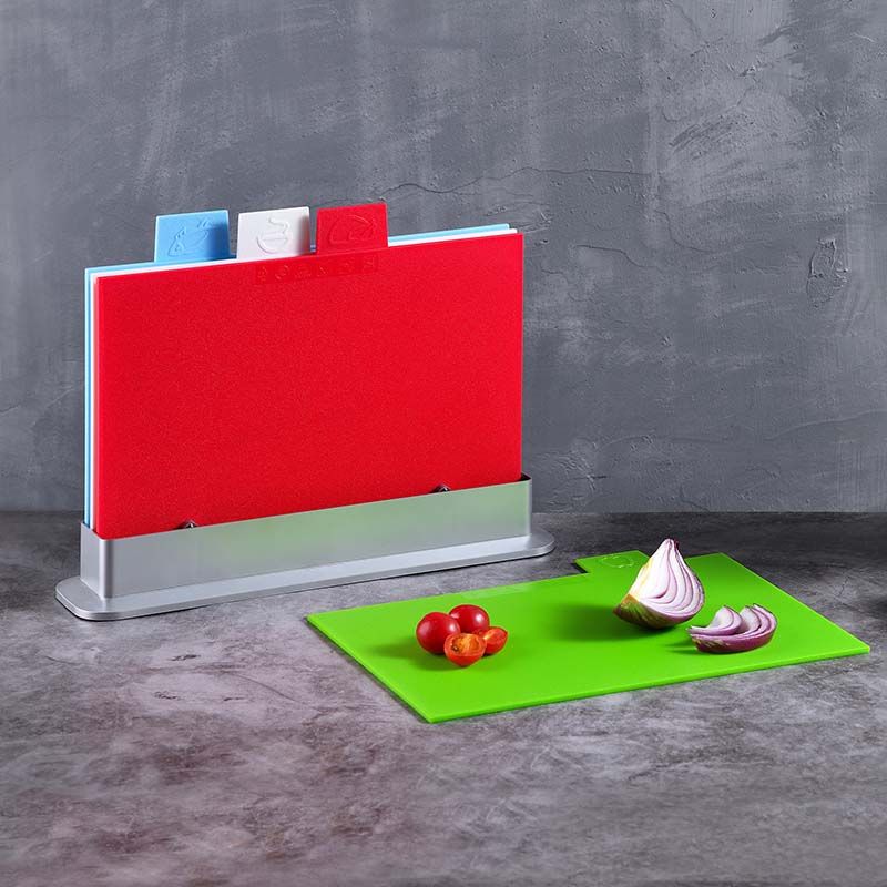 Met deze handige snijplankenset van Ceruzo heb jij altijd een geschikte ondergrond om te snijden. De set is voorzien van een stijlvolle houder en 4 snijplanken, elk in een andere kleur. Daarnaast beschikt elke plank over een icoontje, hierdoor kan je elke plank voor een ander type voedsel gebruiken, dit om kruisbesmetting te voorkomen.. Zo wordt de groene plank gebruikt voor het snijden van groentes, rood voor vlees, wit voor gekookt/gebakken eten en blauw voor vis.