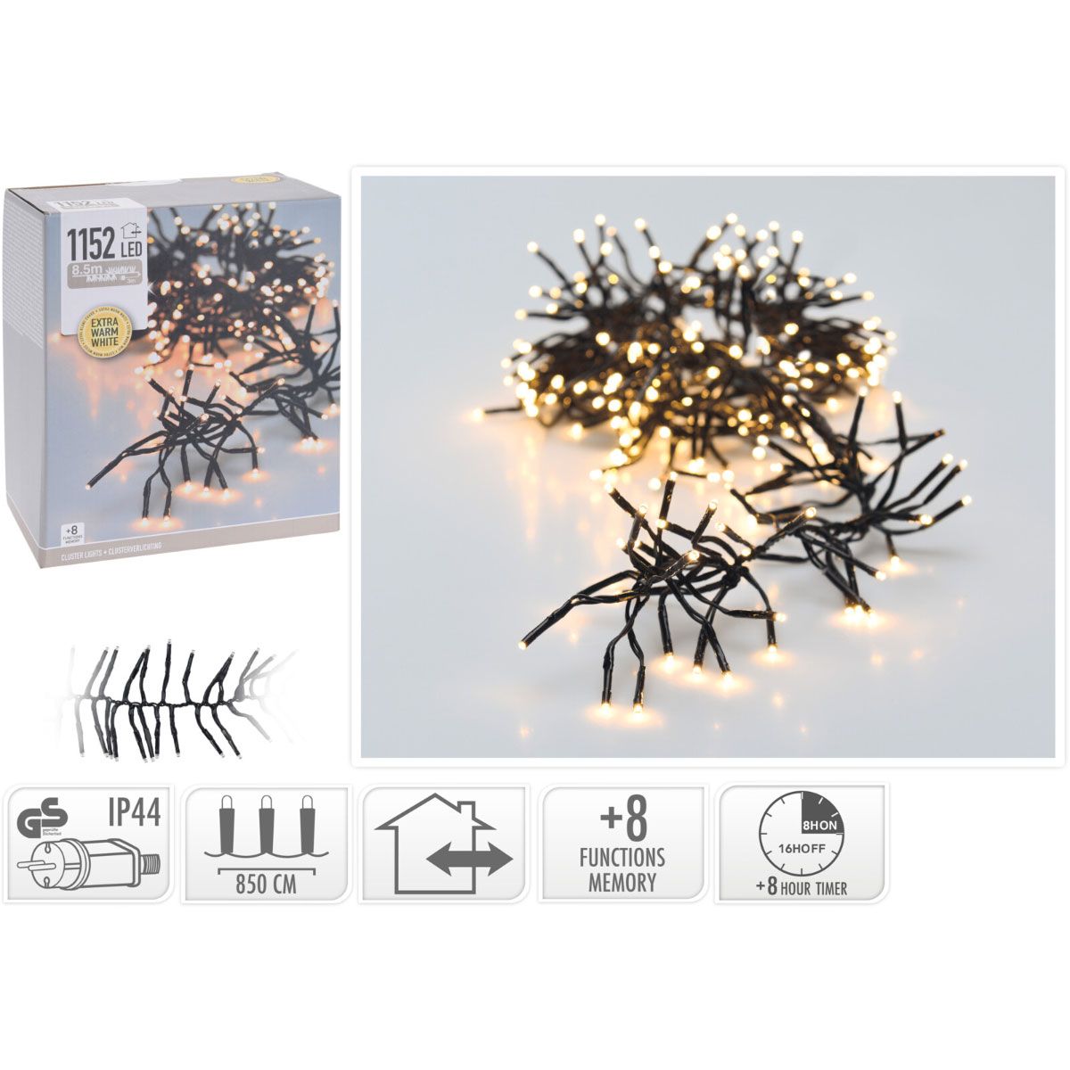 - clusterlengte: 8.5 meter, aanloopsnoer 3 meter