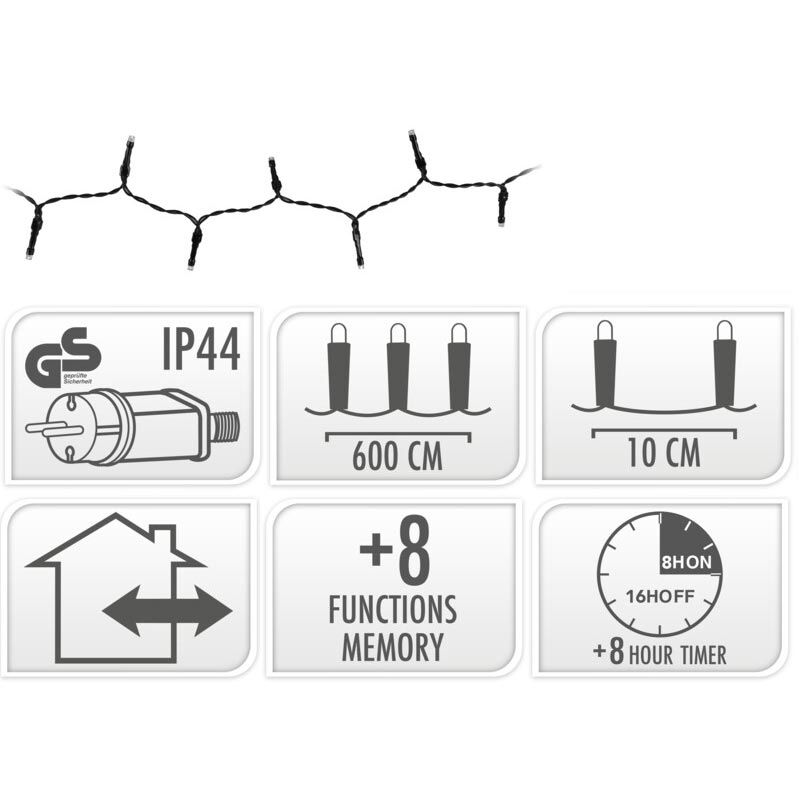- 8 lichtfuncties: 1.Combination, 2. In wave, 3.Sequential, 4. Slo glo, 5. Chasing/flash, 6.Slow fade, 7.Twinkle/flash, 8.Steady on