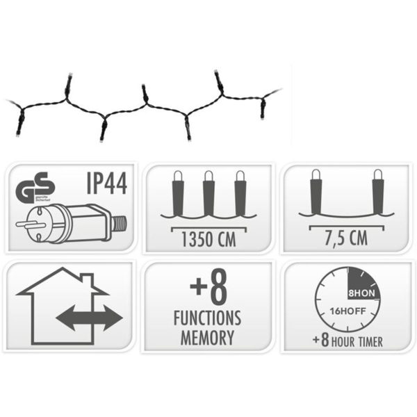 • 8 lichtfuncties: 1.Combination, 2. In wave, 3.Sequential, 4. Slo glo, 5. Chasing/flash, 6.Slow fade, 7.Twinkle/flash, 8.Steady on