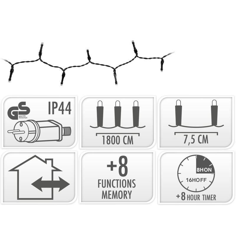 - 8 lichtfuncties: 1.Combination, 2. In wave, 3.Sequential, 4. Slo glo, 5. Chasing/flash, 6.Slow fade, 7.Twinkle/flash, 8.Steady on