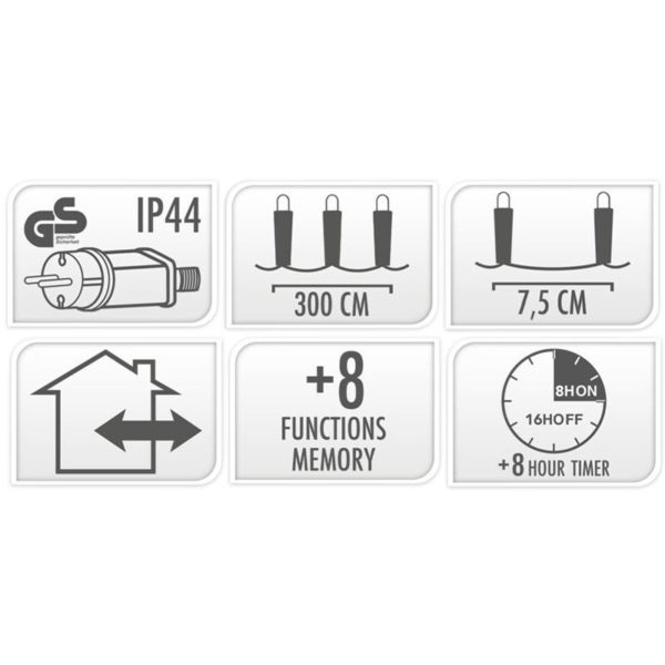 • 8 lichtfuncties: 1.Combination, 2. In wave, 3.Sequential, 4. Slo glo, 5. Chasing/flash, 6.Slow fade, 7.Twinkle/flash, 8.Steady on