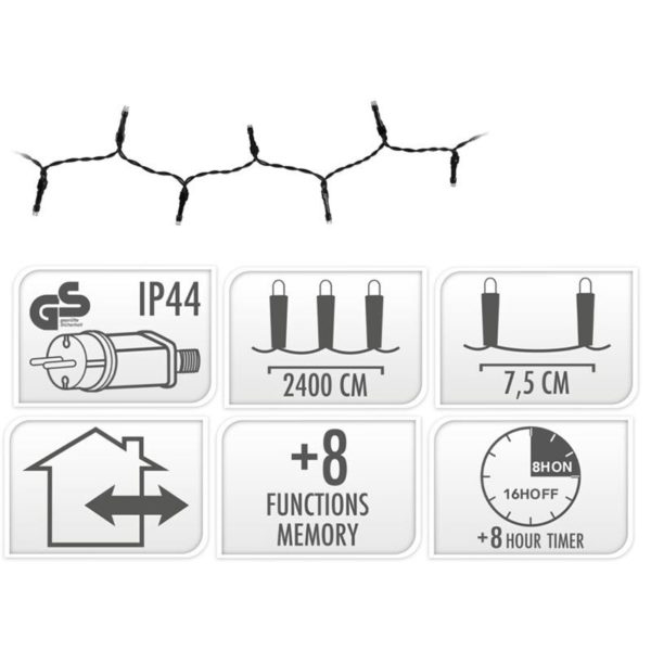 - 8 lichtfuncties: 1.Combination, 2. In wave, 3.Sequential, 4. Slo glo, 5. Chasing/flash, 6.Slow fade, 7.Twinkle/flash, 8.Steady on