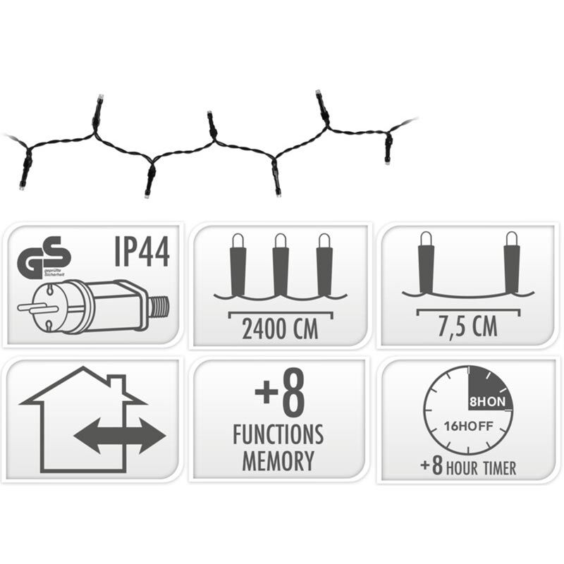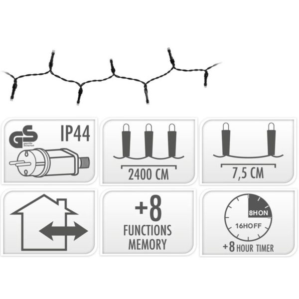 • 8 lichtfuncties: 1.Combination, 2. In wave, 3.Sequential, 4. Slo glo, 5. Chasing/flash, 6.Slow fade, 7.Twinkle/flash, 8.Steady on
