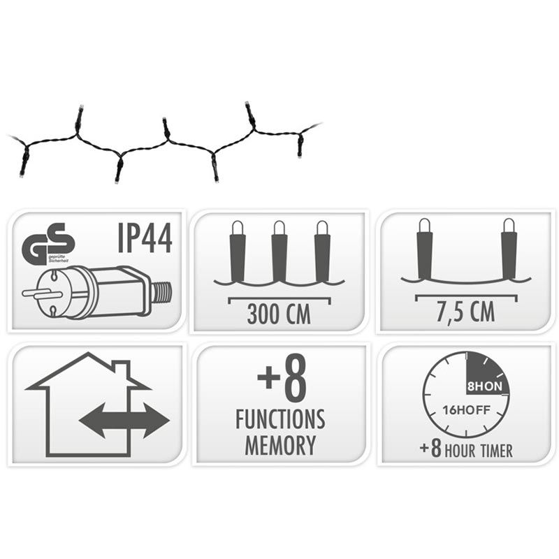 - 8 lichtfuncties: 1.Combination, 2. In wave, 3.Sequential, 4. Slo glo, 5. Chasing/flash, 6.Slow fade, 7.Twinkle/flash, 8.Steady on