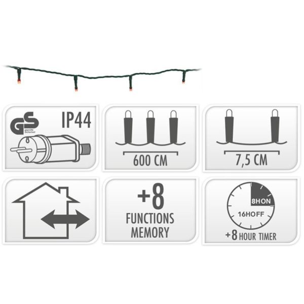- 8 lichtfuncties: 1.Combination, 2. In wave, 3.Sequential, 4. Slo glo, 5. Chasing/flash, 6.Slow fade, 7.Twinkle/flash, 8.Steady on
