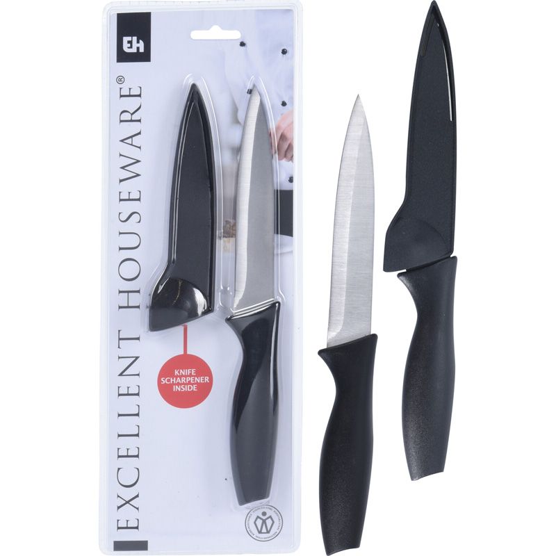 Dit keukenmes heeft zijn eigen beschermhoes met geïntegreerde messenslijper.