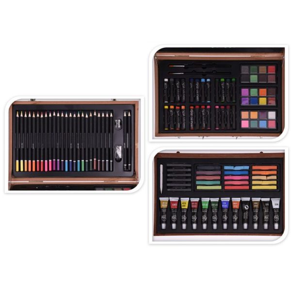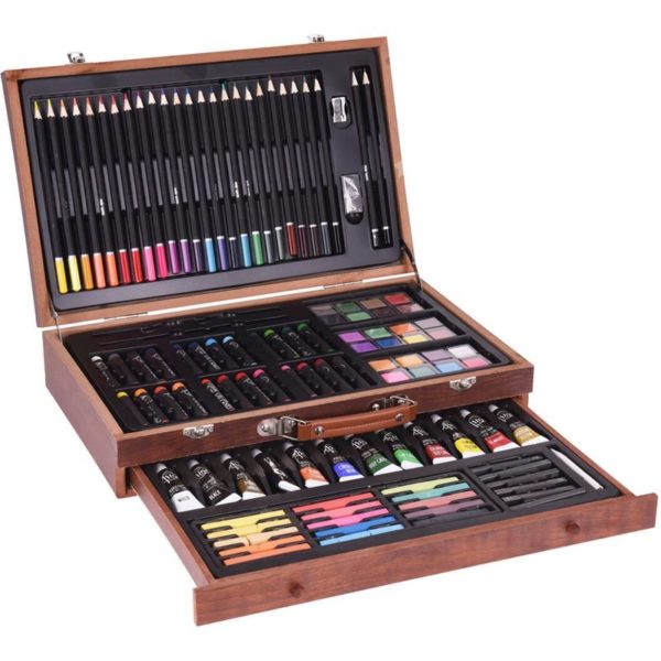 Deze houten koffer bevat 112 stuks aan teken- en schildermateriaal waar elke creatieveling enthousiast van wordt. Door de 2 sloten is de koffer goed vast te maken en met het handvat makkelijk te verplaatsen.